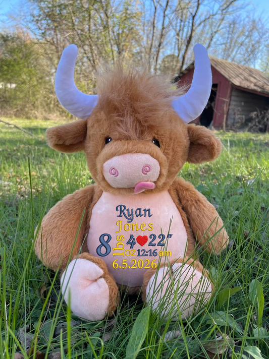 Personalised Highland Cow Embroidered Name with Birth Info Teddy